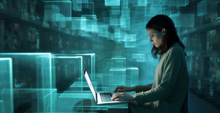 אנשים על רקע שקיעה עם גרפיקת סייבר